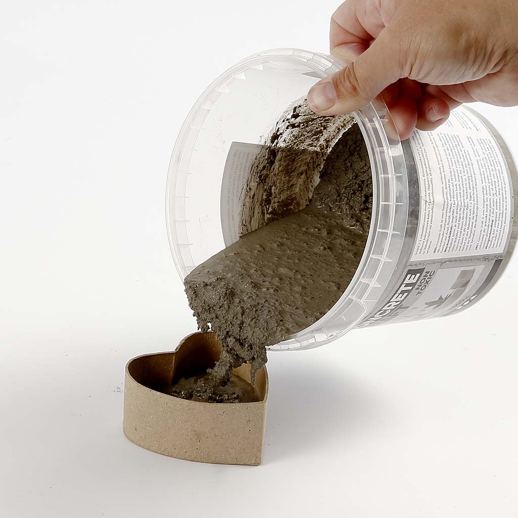 Betón môžeme liať do akejkoľvek formy. Ak ste sa rozhodli pre papierovú formu napr. papierovú krabičku, tak vnútornú stranu krabičky natrite lakom, aby sa zabránilo rozpusteniu papiera z mokrého betónu a nechajte vyschnúť. Vyschnutú krabičku natrite akýmkoľvek olejom na varenie, aby sa krabička neprilepila na betón. Namiešajte betón v správnom pomere a nalejte ho do krabičky. Nechajte odpočívať aspoň 5 minút a vopchajte dnu kovovú nádobu na čajovú sviečku. Nechajte schnúť minimálne 24 hodín. Po 24 hodinách odstráňte papier. Ak sú stopy po oleji, tak ho stačí umyť mydlovou vodou. Podobným spôsobom sa dajú spraviť aj ozdoby. Pripravte si krabičku, do ktorej vložte vymodelovanú zátku, ktorú neskôr vyberte a vznikne dierka na zavesenie. Ešte do mokrého betónu môžete vložiť sklenené sklíčka.