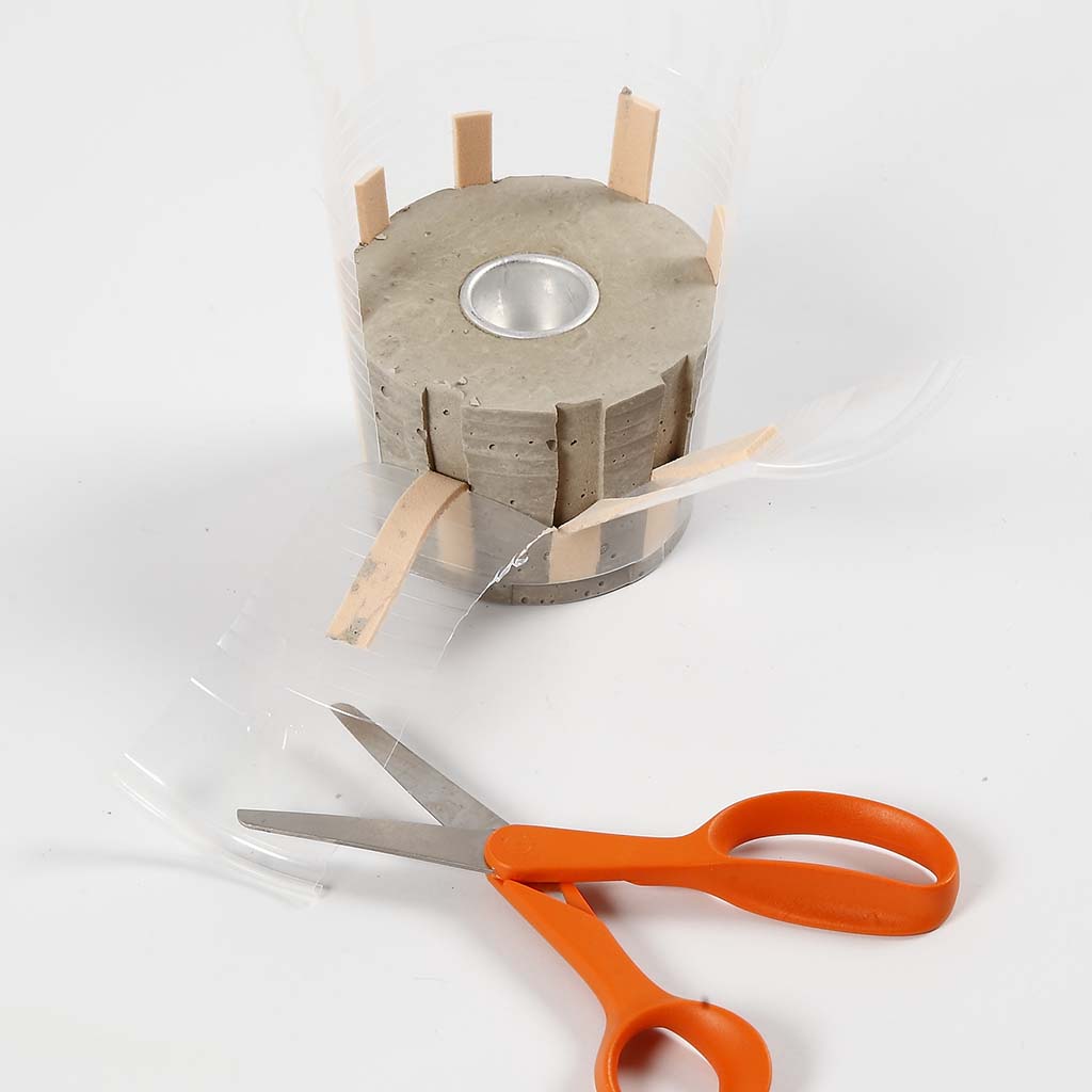 Formu si môžete jednoducho vyrobiť aj z plastu – napr. z plastovej fľaše. Pomocou pravítka ju zohnite, nastrihajte a znova prilepte. Tak Vám vzniknú netradičné formy. Do takto pripravenej formy nalejte betónovú zmes a pokračujte podľa prvého návodu.