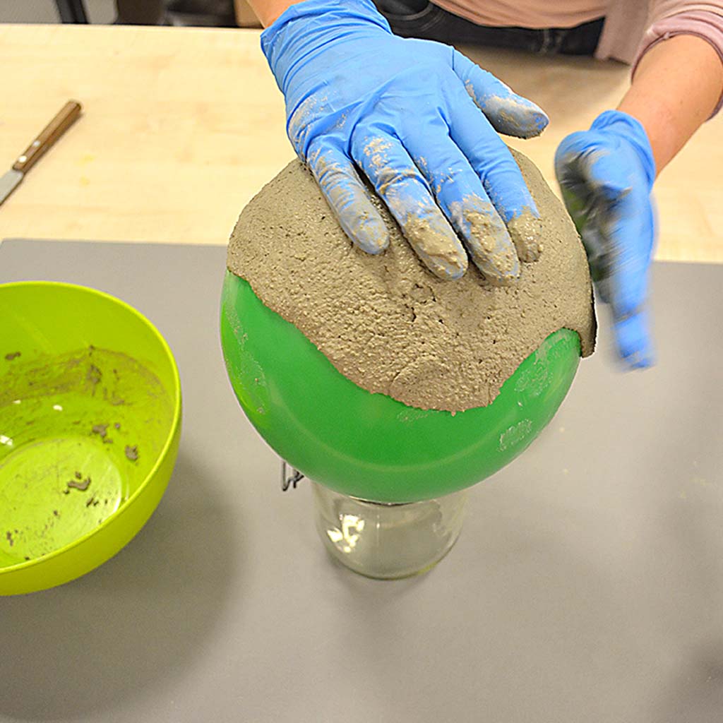 Nafúkame balón a postupne nanášame betón, ktorý necháme vyschnúť aspoň 24 hod. Po 24 hod. urobíme na balóne dierku a odlepíme od betónu. Vnútro natrieme metalickou farbou.
