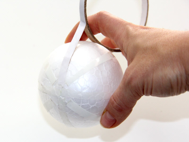 Okolo celej polystyrénovej gule nalepíme obojstrannú lepiacu pásku. Môžeme použiť pri lepení aj lepiacu pištoľ.