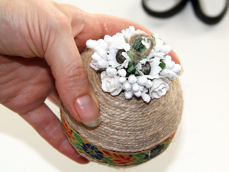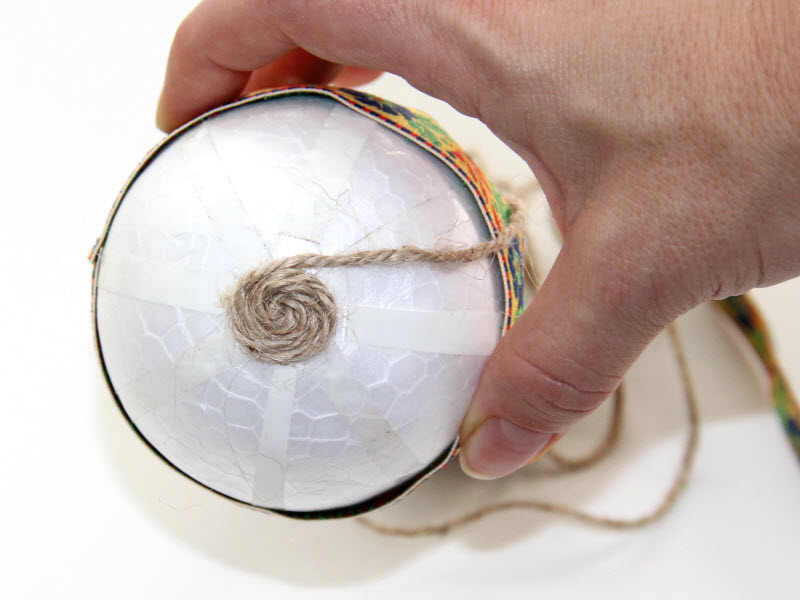 Z jutovej šnúrky urobíme slimáčika a prilepíme na polystyrénovú guľu. Obmotávame guľu až k stuhe. Kraj stuhy mierne skryjeme pod jutovú šnúrku. Koniec šnúrky prišpendlíme alebo prilepíme ku guli. Tak isto obmotáme šnúrkou aj druhú polovicu polystyrénovej guli.