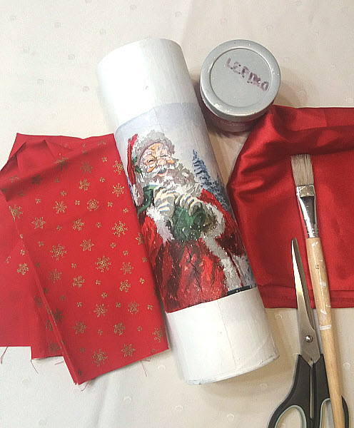 Krabičku natrieme bielou farbou aby vynikla servítka a necháme vyschnúť. Miesto, kde chceme nalepiť servítku natrieme decoupage lepidlom a nalepíme len vrchnú časť servítky. Okolo servítky nalepíme látku. Aby sme zakryli spoje medzi servítkou a látkou tak natrieme ich trblietavým lepidlom alebo nalepíme stuhu alebo ozdobnú lepiacu pásku. Lepidlom taktiež natrieme aj vrchnák.