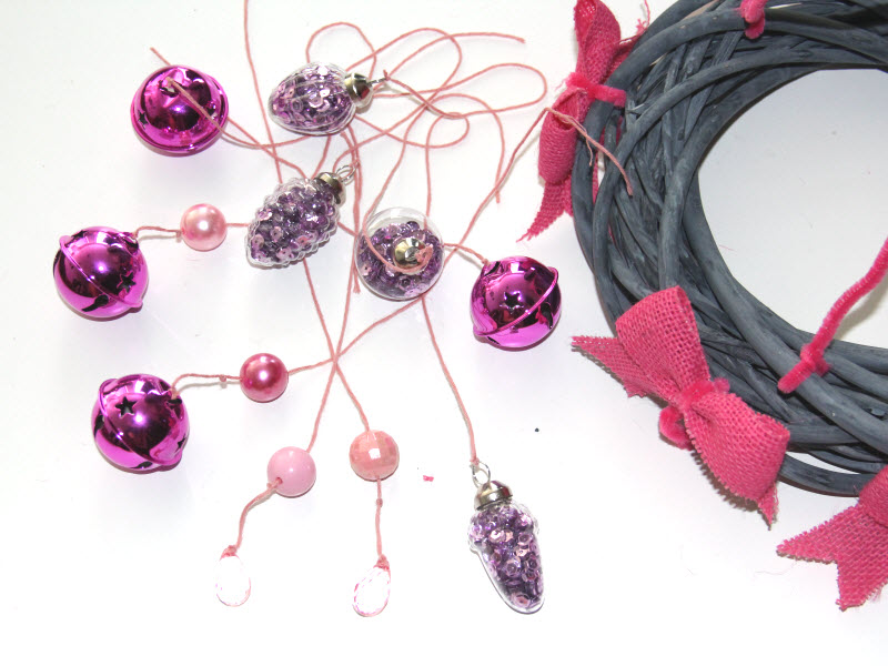 Drôtikom mašle pripojíme k venčeku. Z troch drôtikov si vytvoríme háčik na zavesenie. Všetky ozdoby – rolničky, sklenené ozdoby, korálky navlečieme na ružovú šnúrku a zavesíme na veniec.
