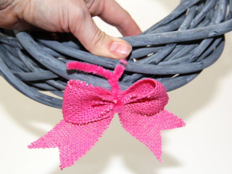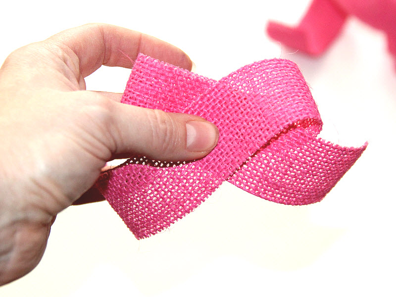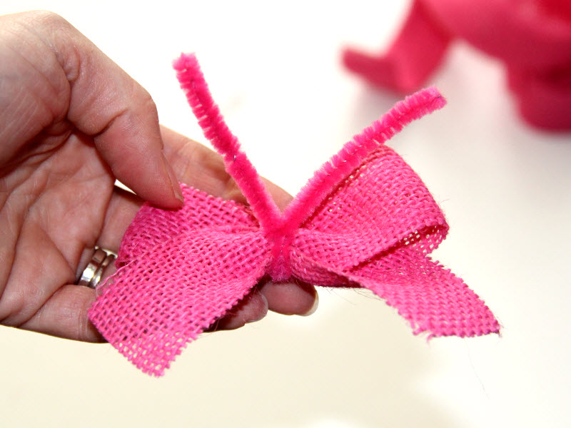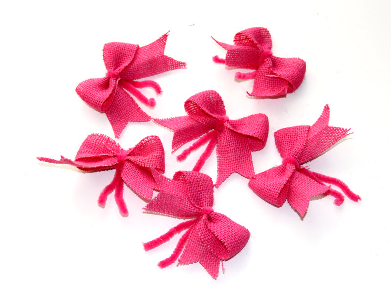 Z jutovej stuhy nastriháme kratšie prúžky, z ktorých vytvoríme mašličky. Zložíme stuhu podľa obrázka a v strede spojíme chlpatým drôtikom. Na koncoch vytvoríme nožnicami V.