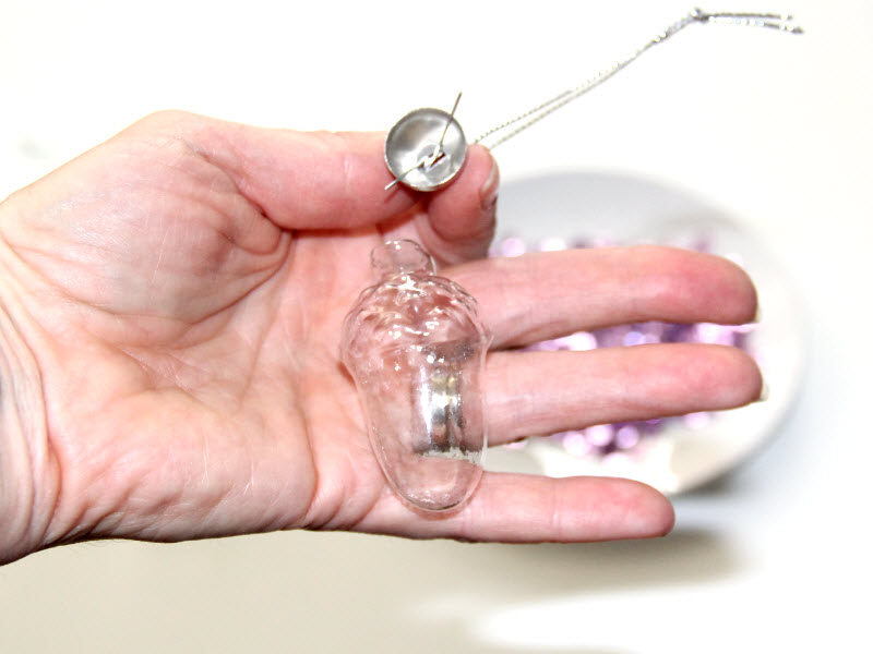 Zo sklenených ozdôb opatrne vytiahneme závesné očko a nasypeme do vnútra flitre. Očko opatrne vložíme späť.